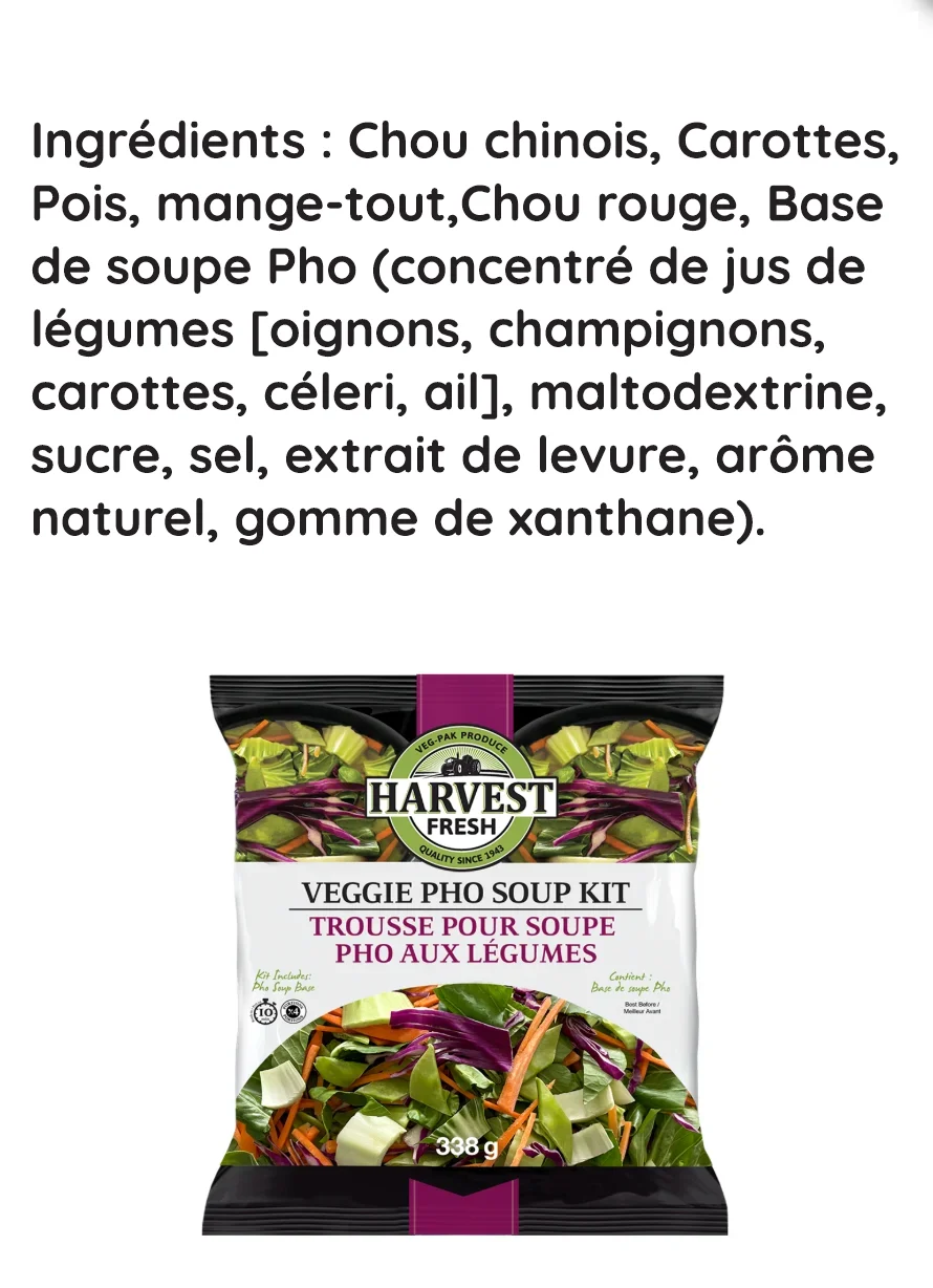 Notre mélange pour soupe Pho aux légumes Harvest Fresh est un mélange coloré de bok choy, carottes, pois mange-tout et chou rouge, accompagné d'une délicieuse base de soupe Pho qui constitue un repas complet à lui seul et accompagne parfaitement n'importe quel plat!