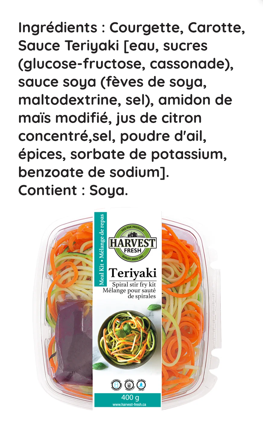 Notre trousse pour sauté de spirales Teriyaki Harvest Fresh est un mélange coloré de carottes et courgettes en spirales, relevé d’une délicieuse sauce Teriyaki. Un plat complet ou un accompagnement idéal avec vos protéines préférées.